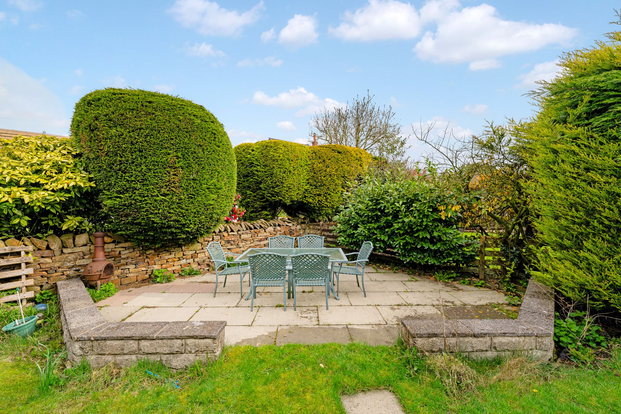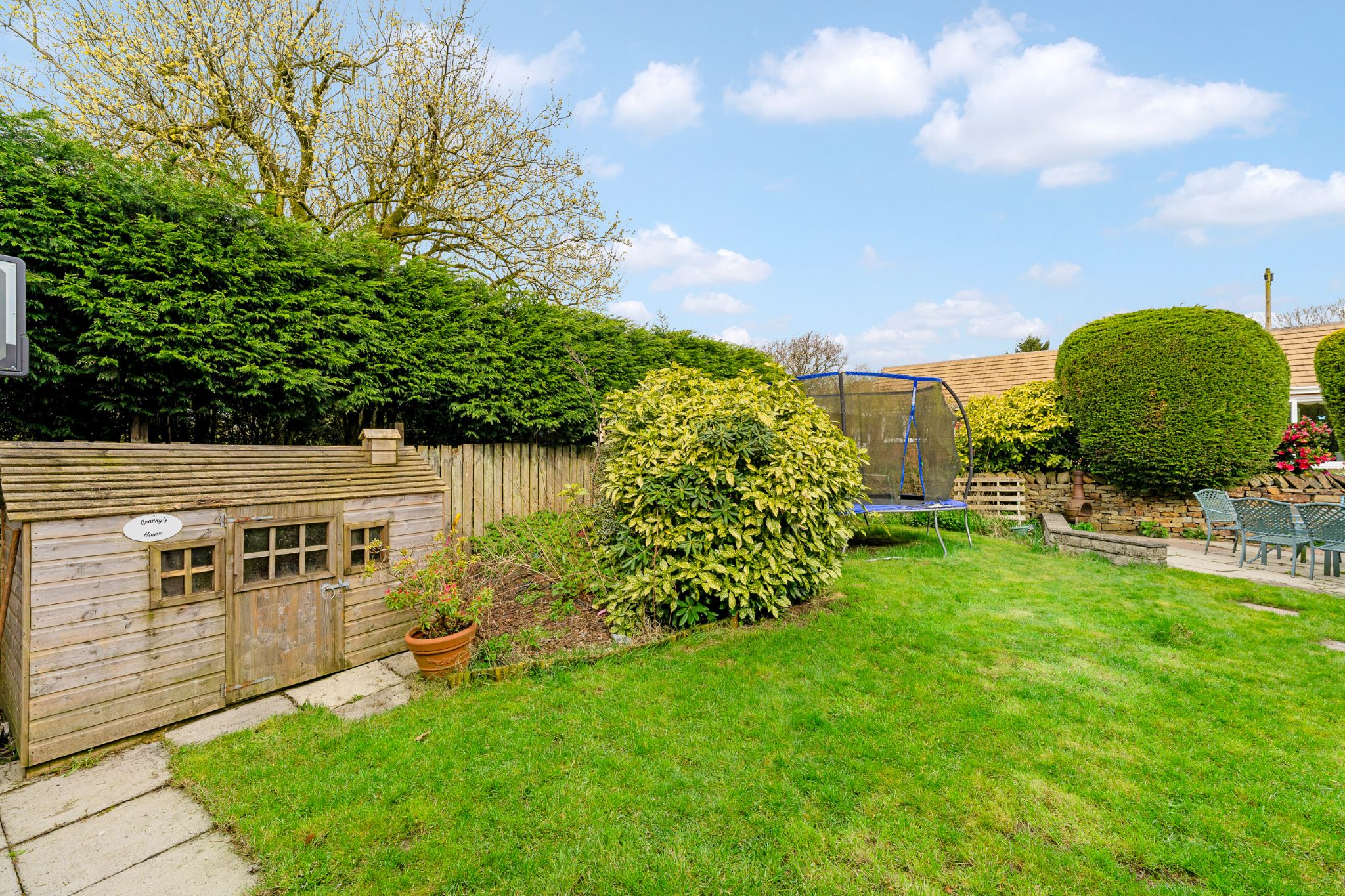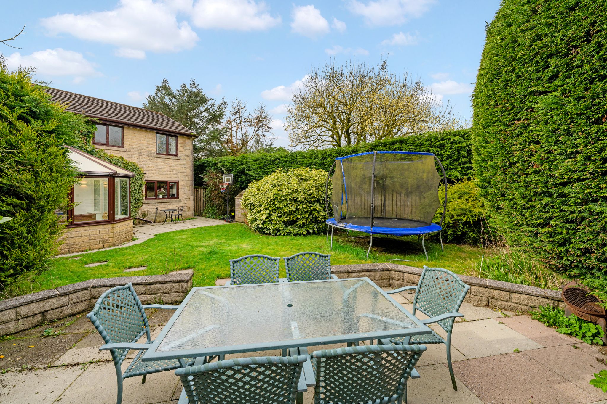 The property boasts a spacious rear garden, featuring a lawn ideal for the children to play, along with two patio areas—perfect for outdoor seating and entertaining during the warmer months. The garden is bordered by established shrubs and space for gardening. Two side gates provide access to the front of the property, one of which leads directly to the double garage. The garage benefits from power and lighting and is fitted with two up-and-overhead doors. A generous driveway also provides off-street parking.