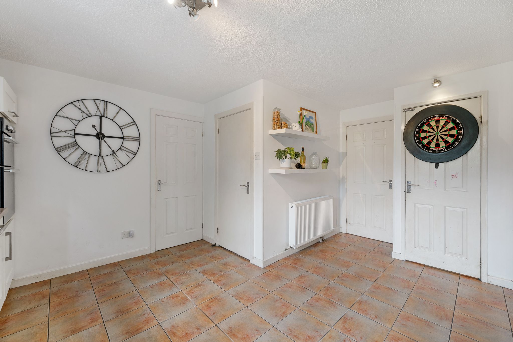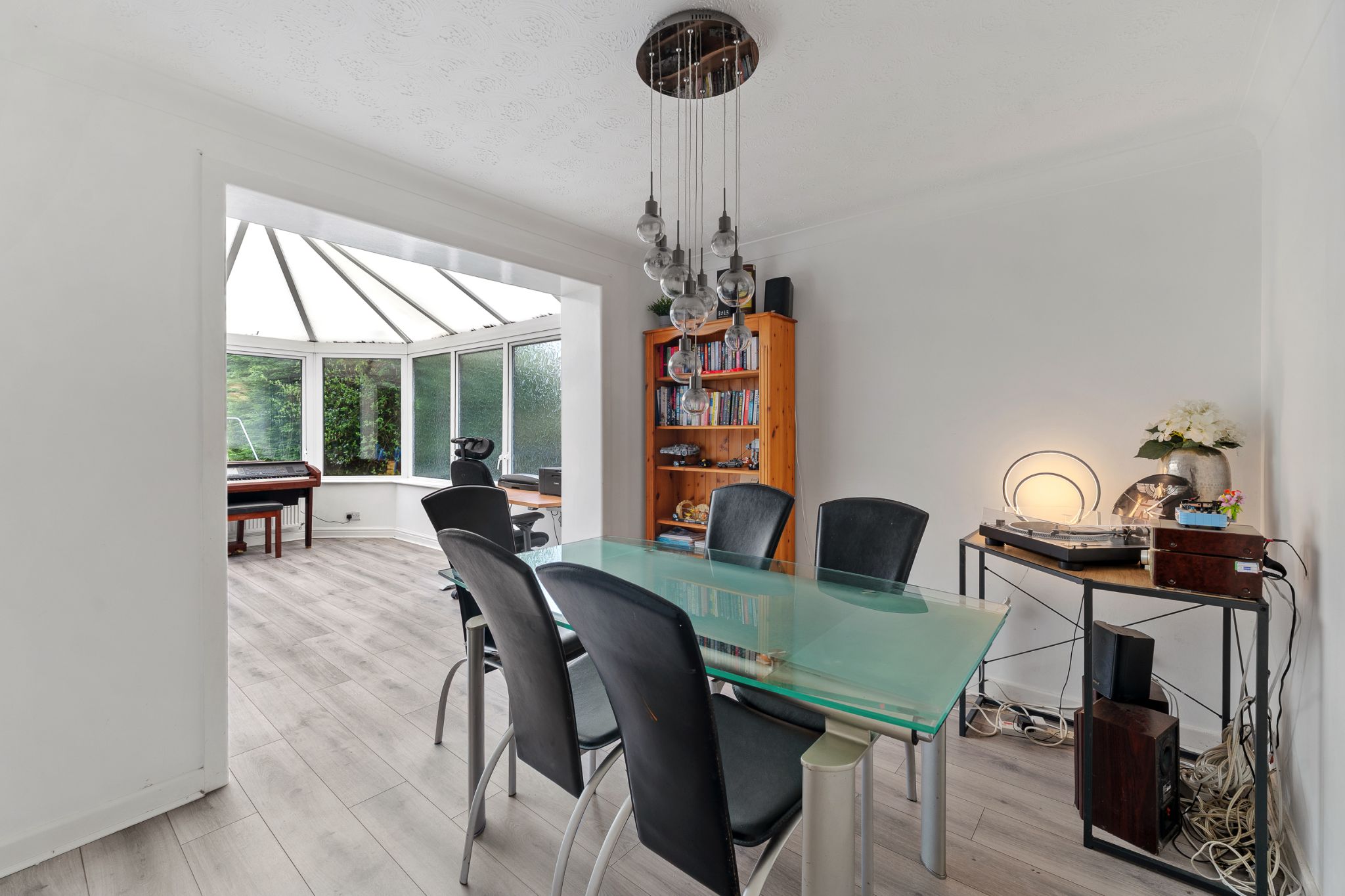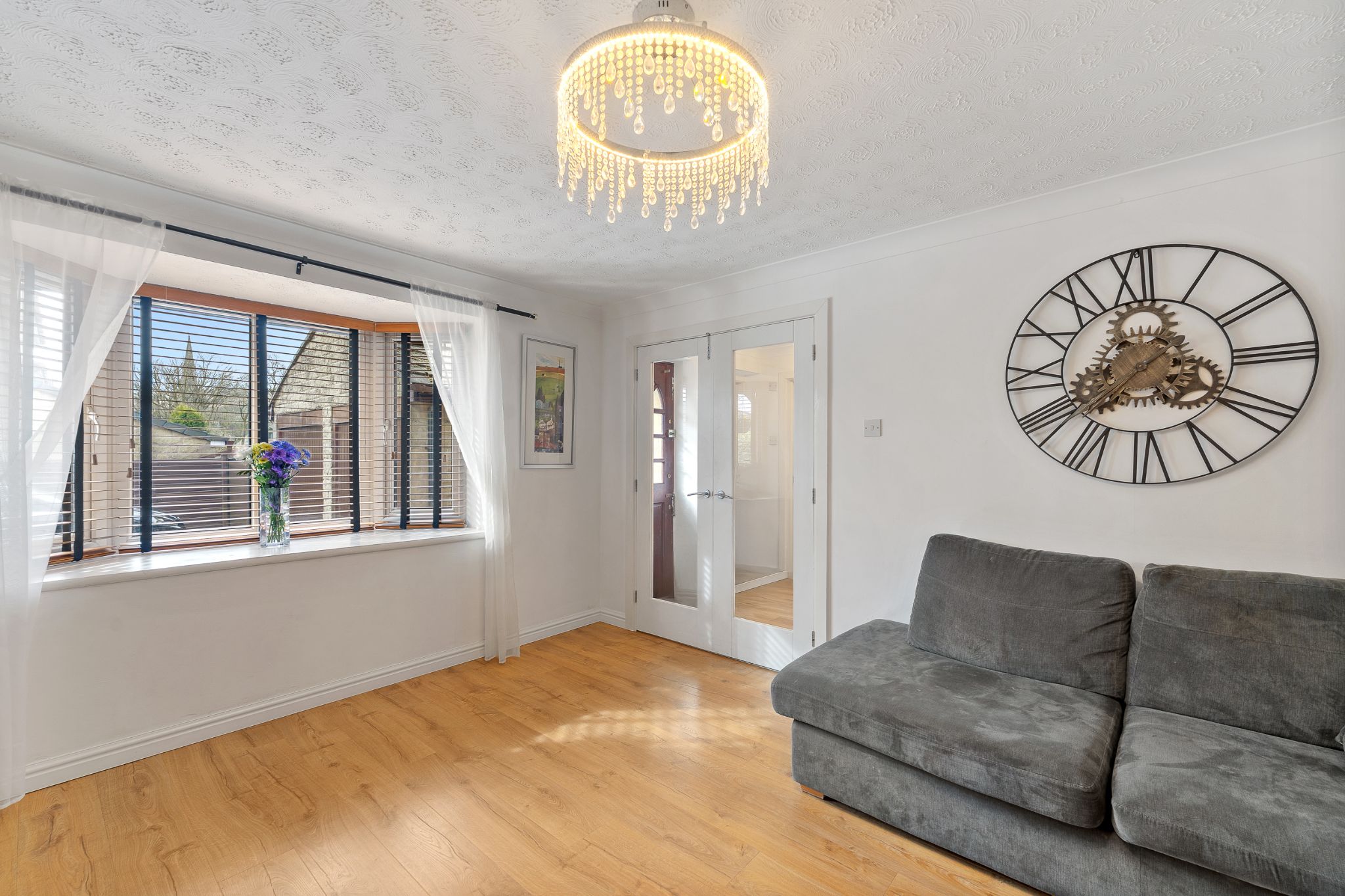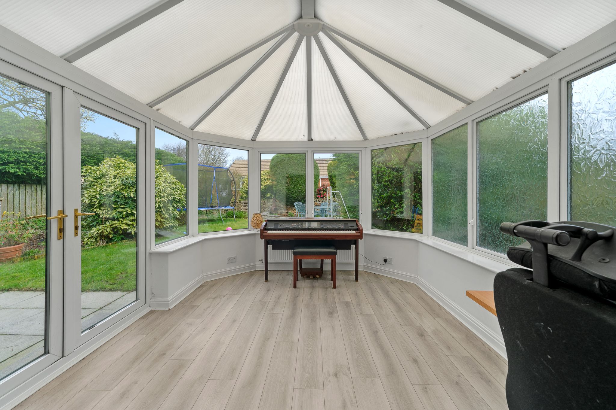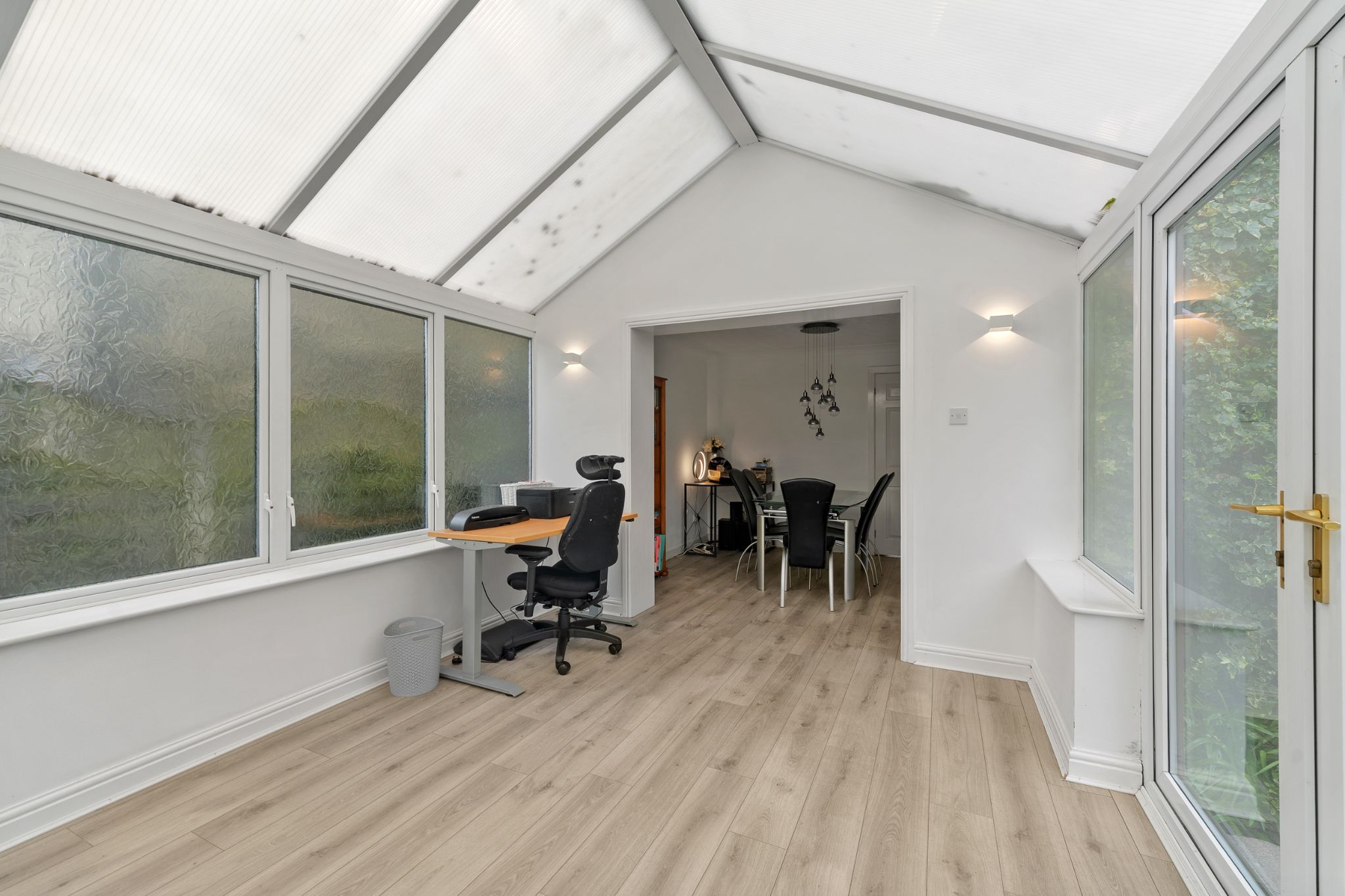 Step into the welcoming entrance hallway and through the double doors to your right you will discover the lounge, featuring a front-facing bay window and stylish wall panelling. A door leads through to the dining area, which offers ample space for a dining table and flows into the conservatory—an ideal additional sitting area. With wraparound windows and patio doors opening onto the rear garden, this space is flooded with natural light. The kitchen can be accessed from the entrance hallway or dining area and is fitted with a range of ivory wall and base units. Integrated appliances include an electric hob, oven, grill, and sink, with additional space for an undercounter fridge and dishwasher. The adjoining utility room offer space for a fridge freezer, washing machine, and dryer, along with a side door providing access to the rear garden. Returning to the entrance hallway, to the left there is a versatile reception room, currently used as a playroom but could be equally suited as a home office or snug. A convenient downstairs WC completes the ground floor.