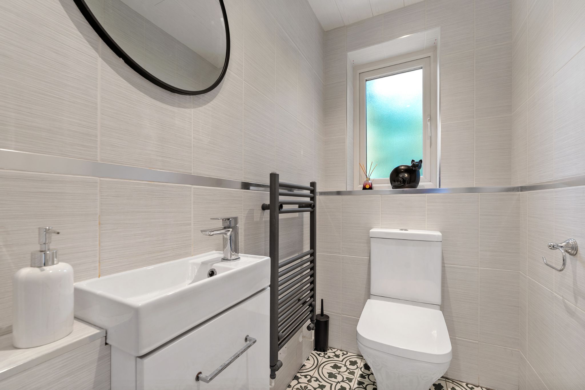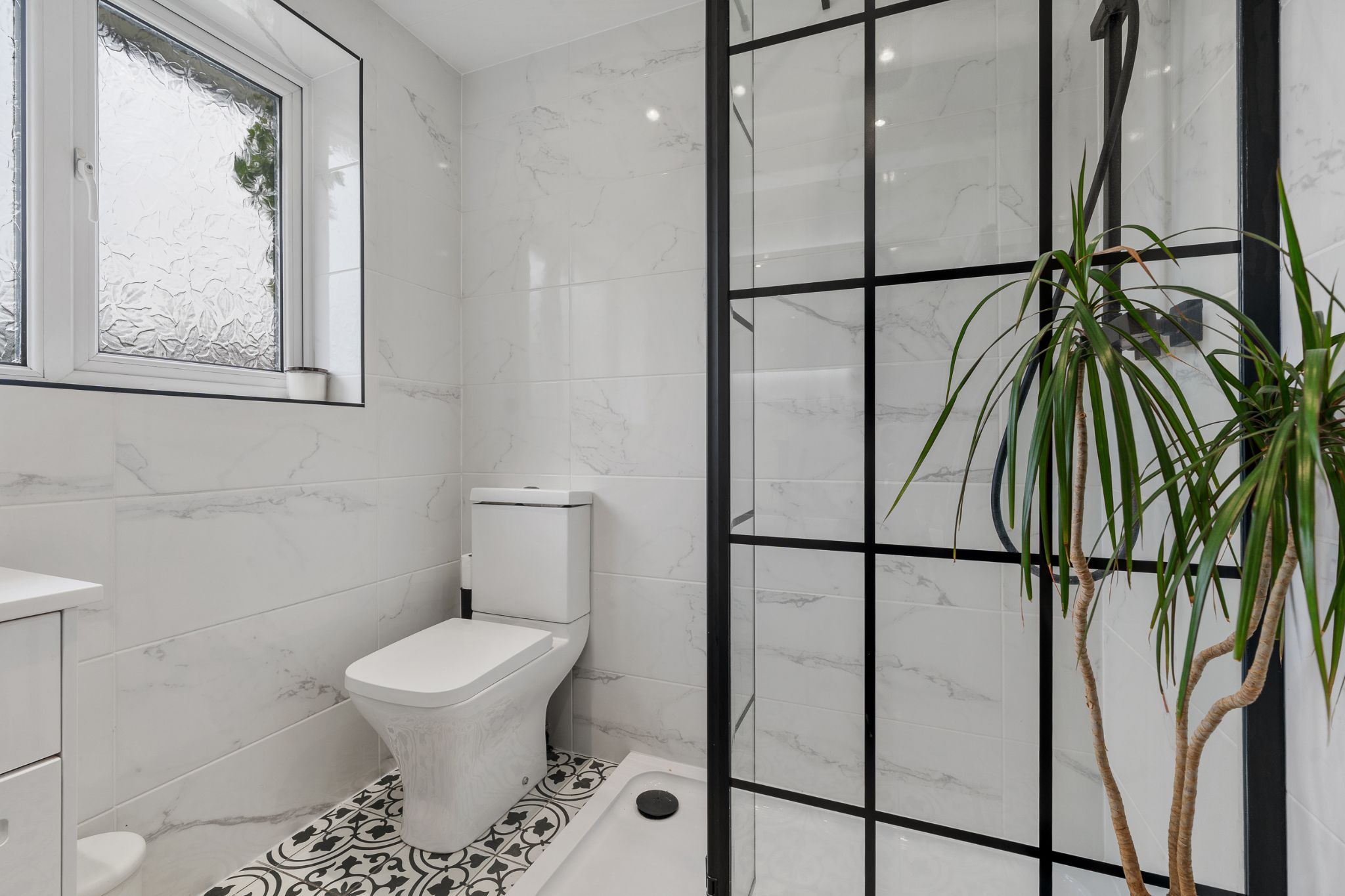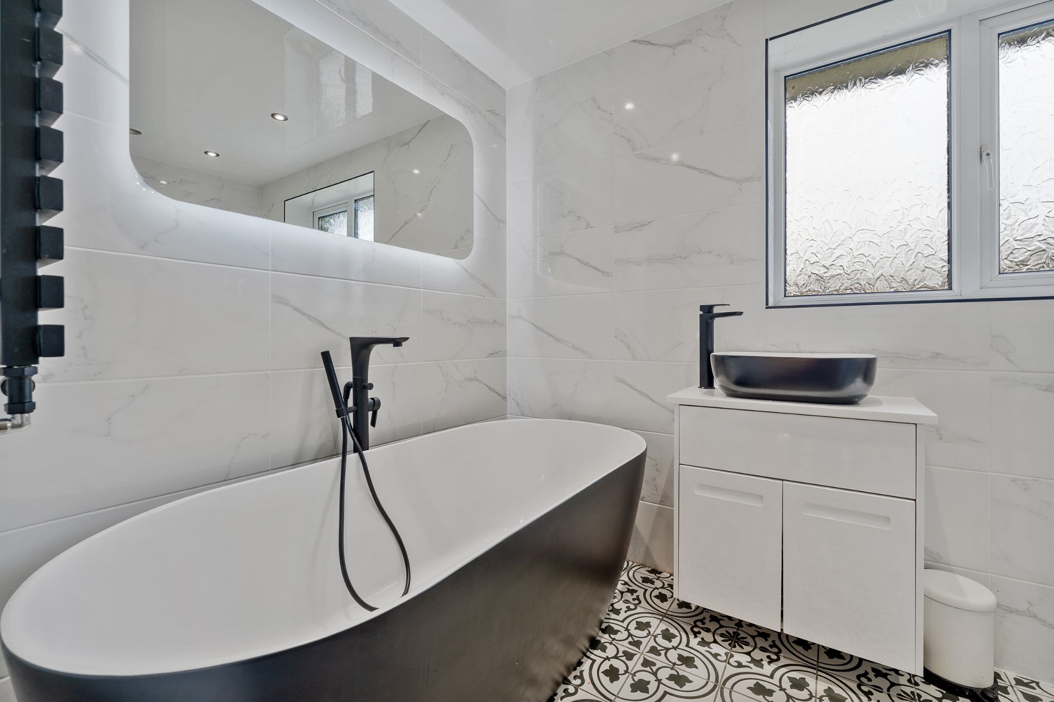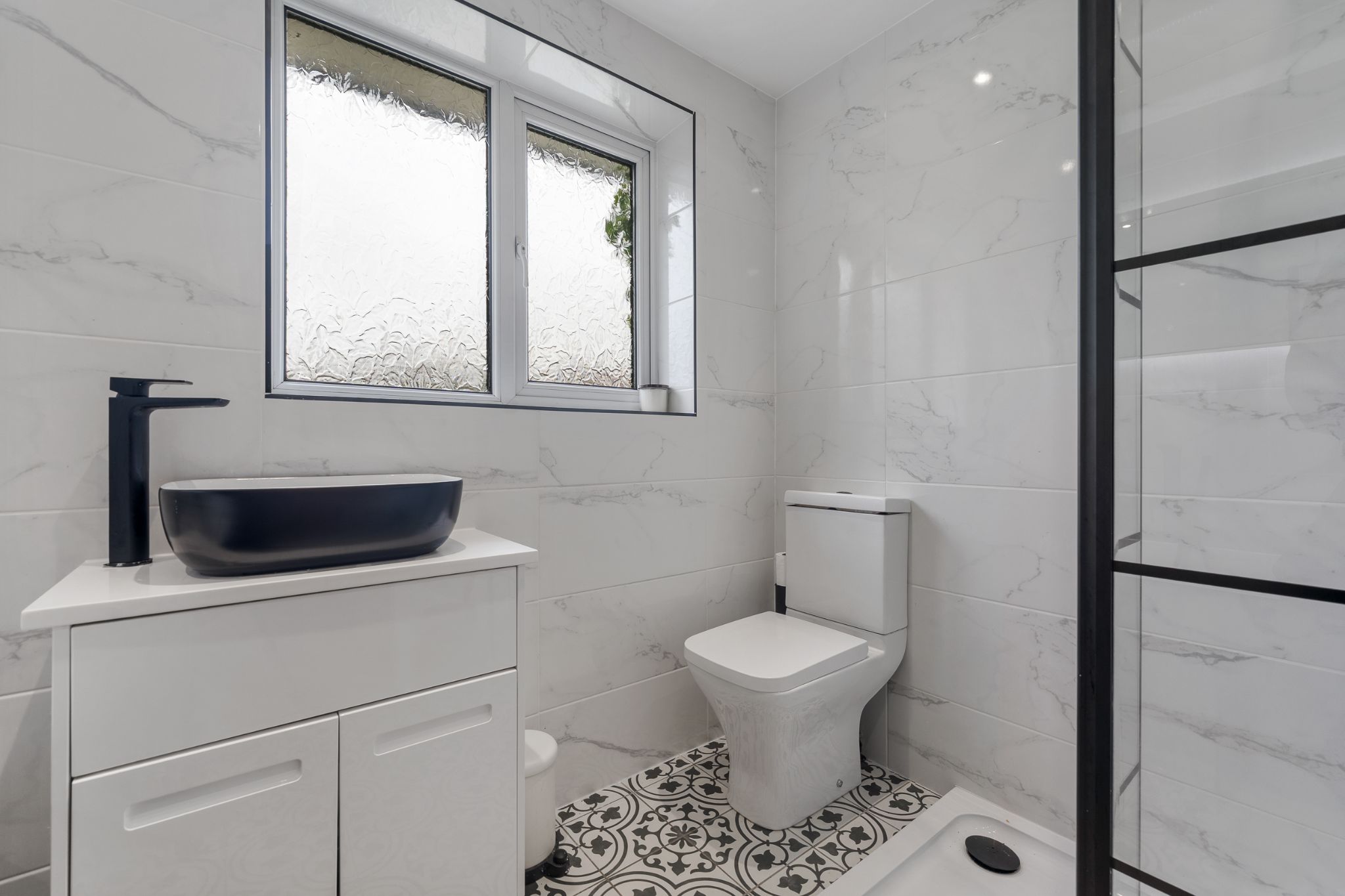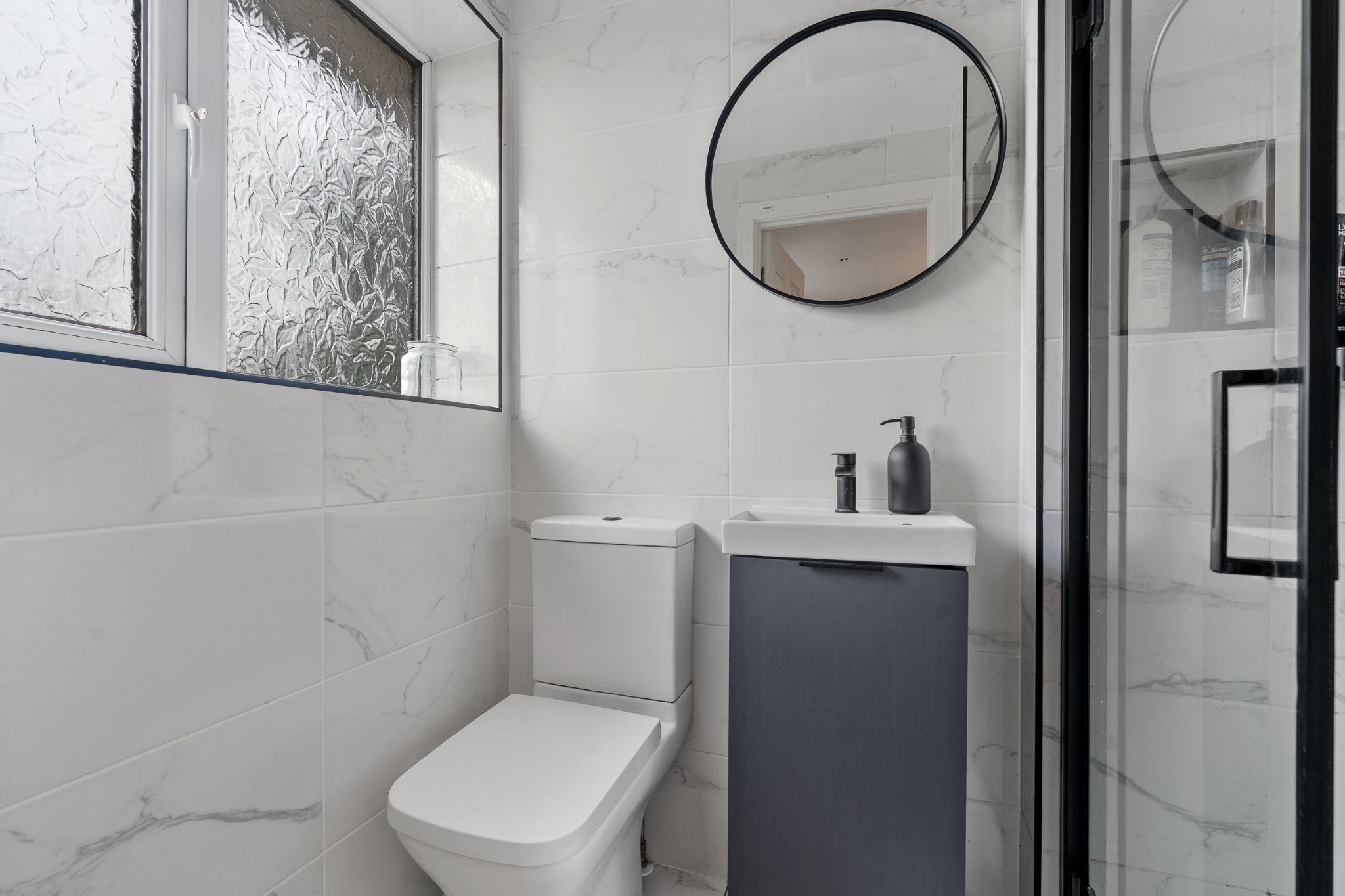 Upstairs, there are four well-proportioned bedrooms and two bathrooms. The master bedroom is a spacious double, featuring fitted wardrobes and a modern ensuite. The ensuite is fully tiled and comprises a WC, vanity basin, and an enclosed shower with both overhead and handheld shower fittings. Bedroom two is positioned to the front of the property and also benefits from fitted wardrobes, while bedrooms three and four are well-sized rooms overlooking the rear garden. The four-piece family bathroom is finished in elegant marble tiling and includes a vanity basin, WC, bath, and a large walk-in shower with both overhead and handheld shower heads.