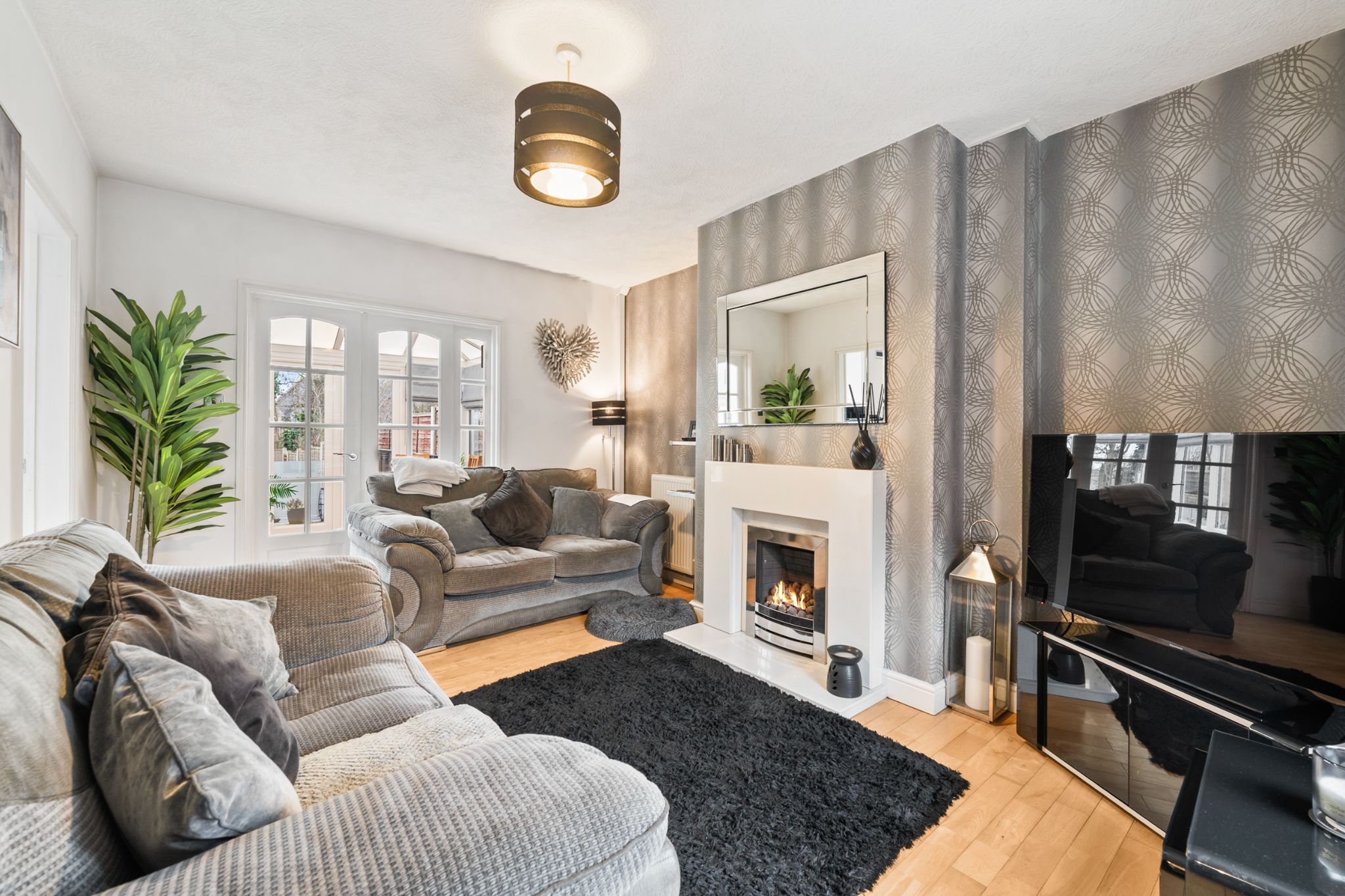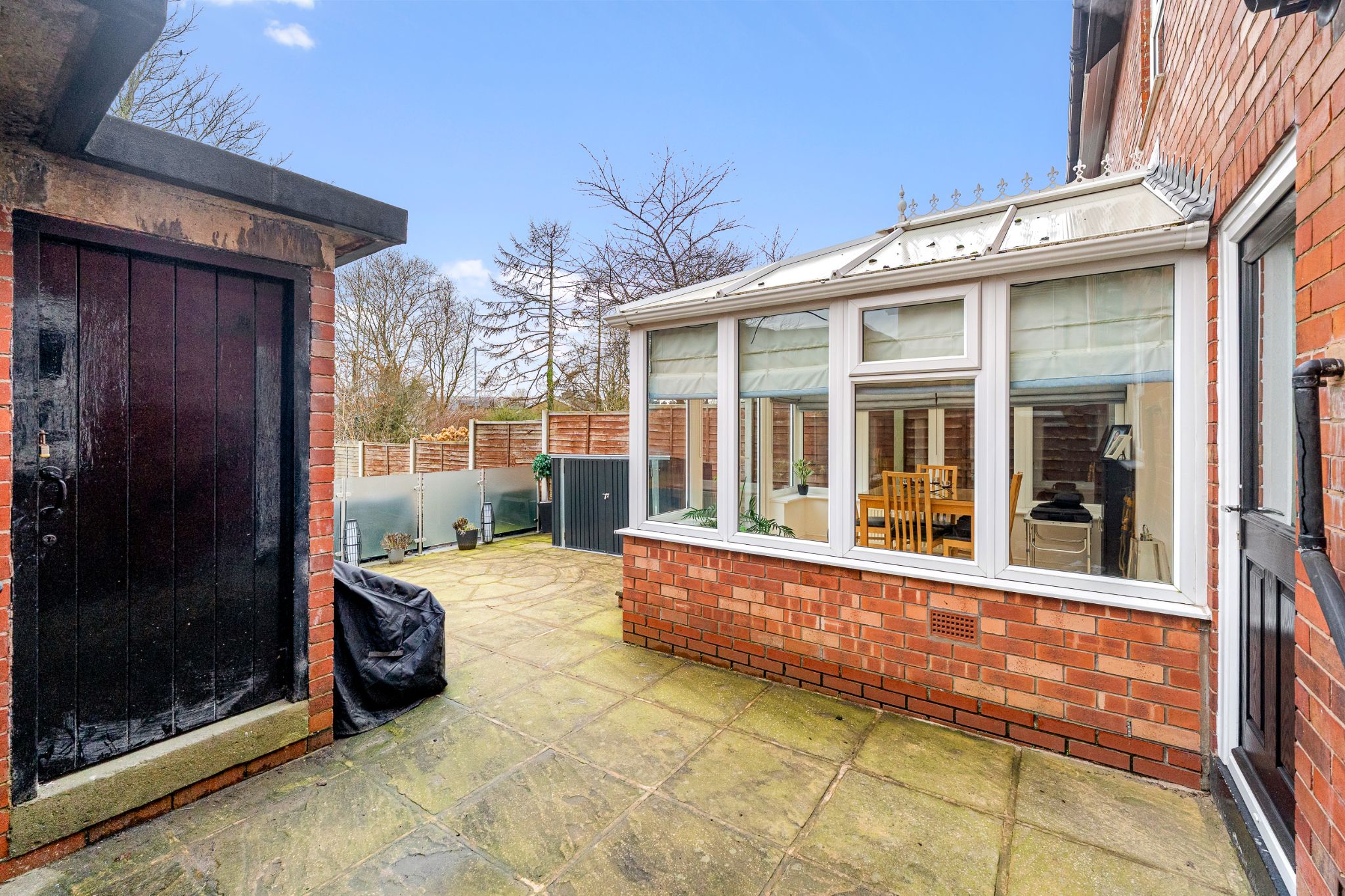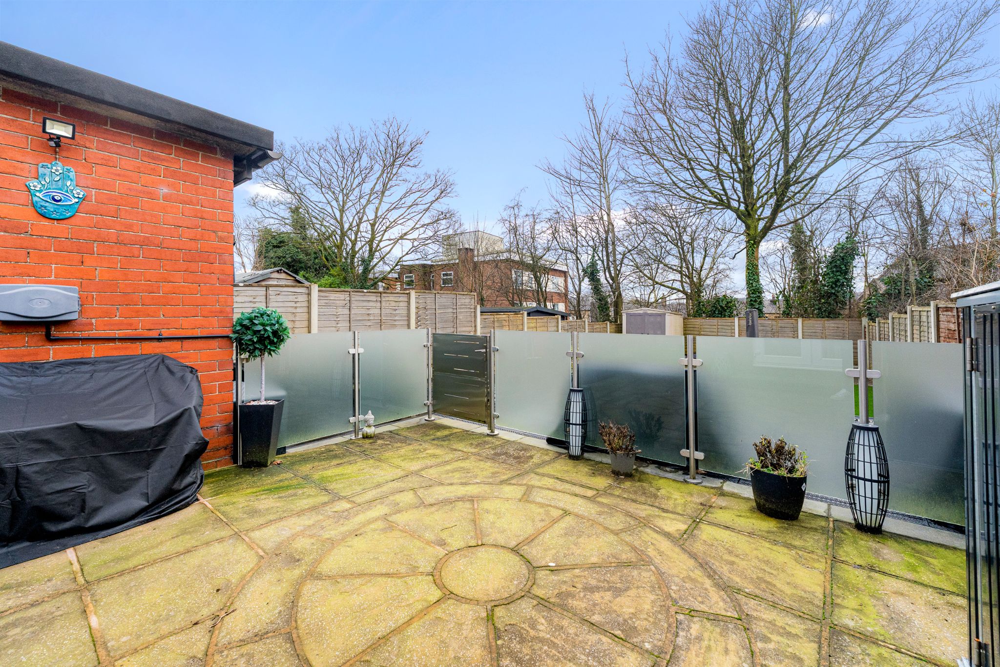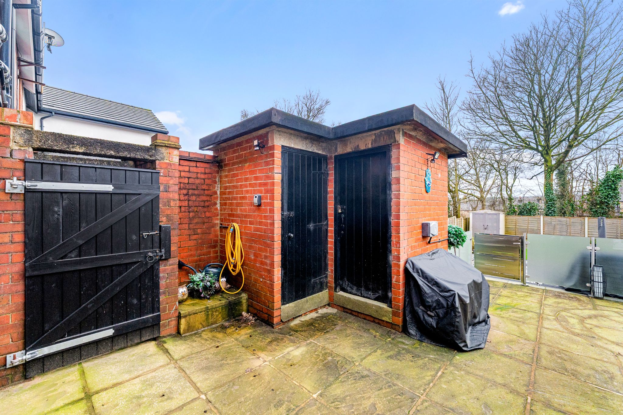To the rear of the home is a generous patio area, ideal for outdoor furniture, bordered by glass balustrades and a gate leading to a further decked patio and an easy-to-maintain Astroturf lawn. Two outhouse storage units provide excellent space for outdoor items and for storing furniture during the colder months. A side gate offers convenient access around to the front of the property, where the driveway is located.