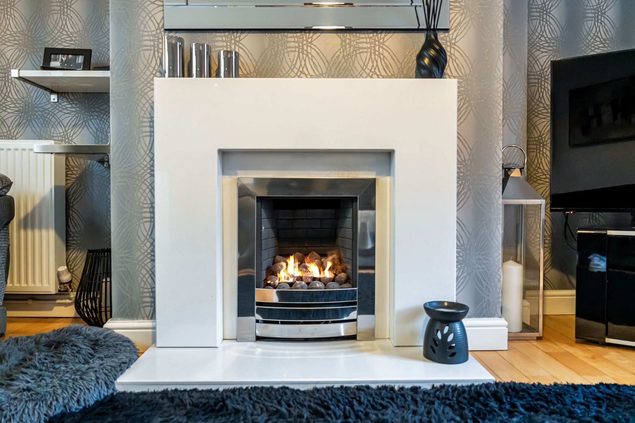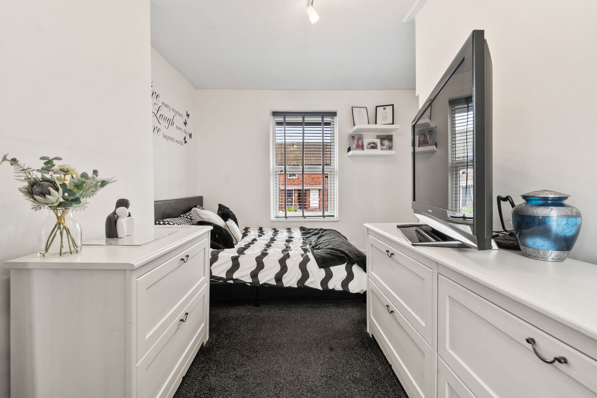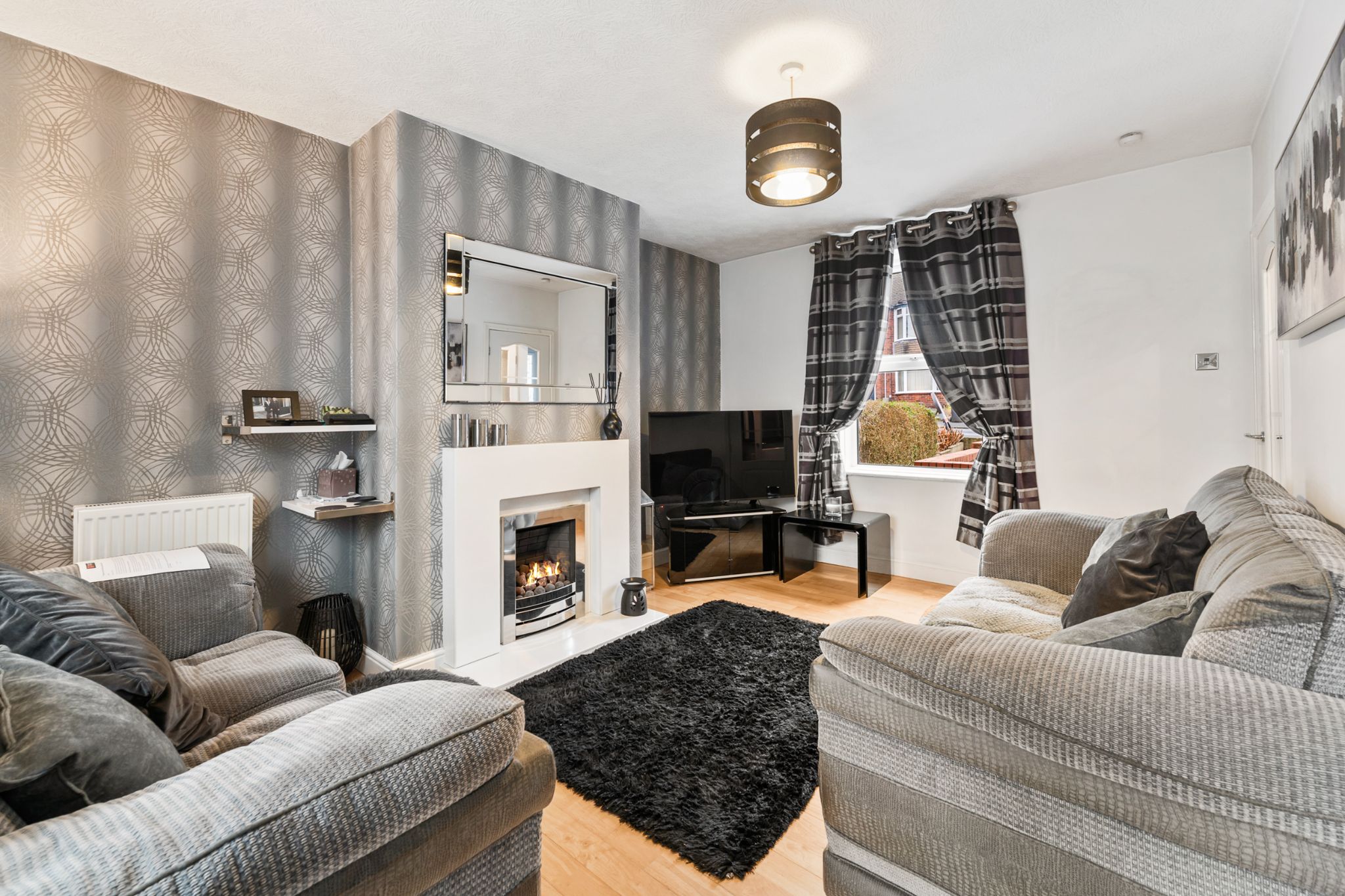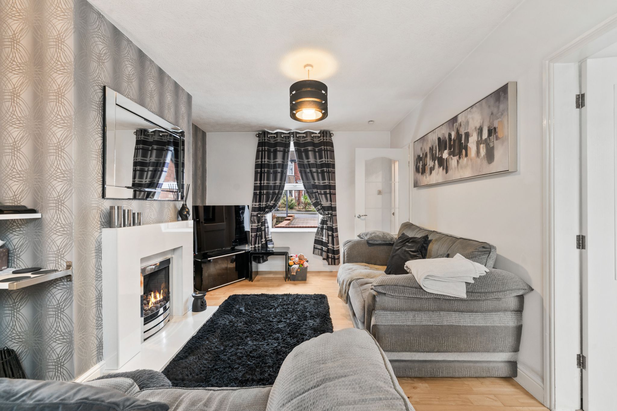 To the rear of the home is a generous patio area, ideal for outdoor furniture, bordered by glass balustrades and a gate leading to a further decked patio and an easy-to-maintain Astroturf lawn. Two outhouse storage units provide excellent space for outdoor items and for storing furniture during the colder months. A side gate offers convenient access around to the front of the property, where the driveway is located.
