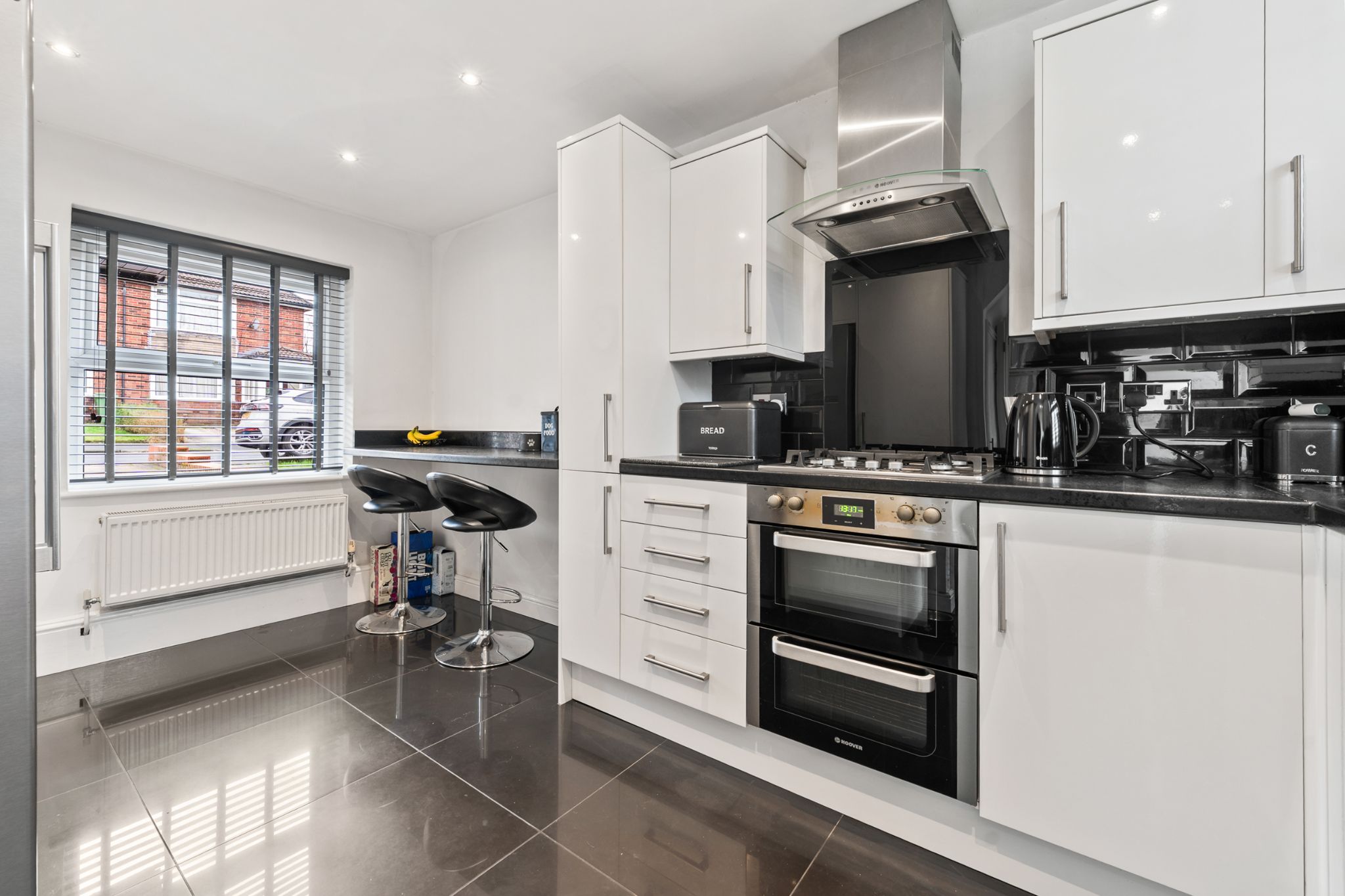 After parking on the driveway, step through the front door into the entrance vestibule with a storage cupboard perfect for your shoes and coats. To the right is the lounge, featuring a gas fire that creates a cosy focal point. The property then flows into the conservatory, a bright and airy space filled with natural light and currently used as a dining room, with patio doors opening onto the rear garden. The extended kitchen is fitted with white gloss wall and base units and benefits from integrated appliances including an oven, gas hob and extractor hood, along with plumbing for a washing machine and space for a fridge freezer. The kitchen also houses the boiler and provides a back door with access to the garden, as well as a breakfast bar to enjoy your morning coffee and an under stair storage cupboard for your miscellaneous household items.